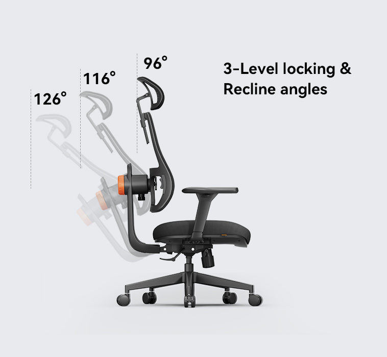 Finden Sie Ihre perfekte Position zwischen 96° und 126°, unterstützt durch synchronisierte Neigungsspannung und müheloses Zurücklehnen.