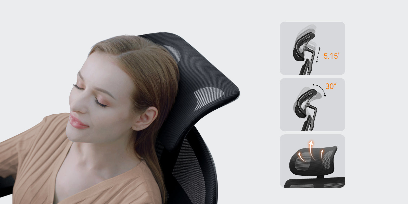The MagicH-BP office chair features a 2D headrest with a 5.15" height adjustment range and a 30° angle adjustment range. It effectively supports your neck, and the mesh fabric provides breathable and comfortable comfort.