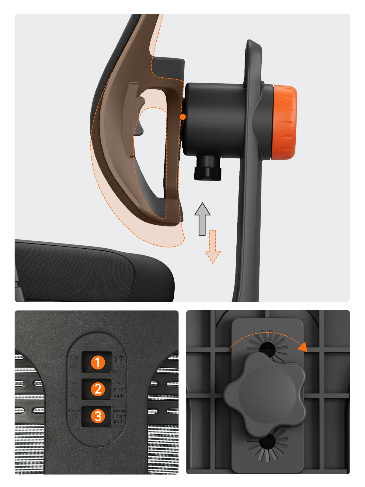 As an ergonomically designed chair, the backrest offers three height adjustments to accommodate users of varying heights (5'1"-6'3"). Simply select the appropriate setting based on your height.