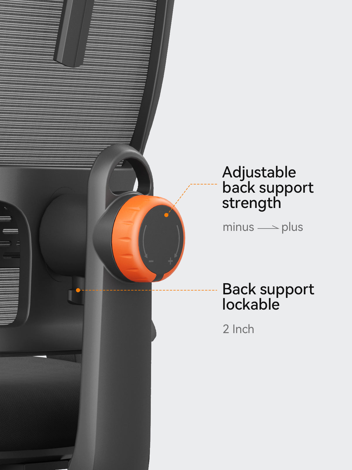 The MagicH-BP chair features adjustable back support intensity, providing appropriate support for users of different weights. Additionally, the backrest follow-length can be locked, offering a personalized setting experience.