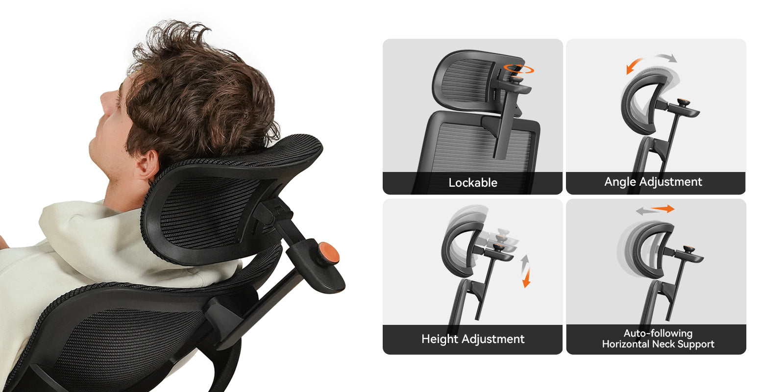 An office chair with neck and back support actively corrects posture imbalances. Ours 5D headrest to adjust headrest height/tilt in real-time, preventing the "tech neck" slump.