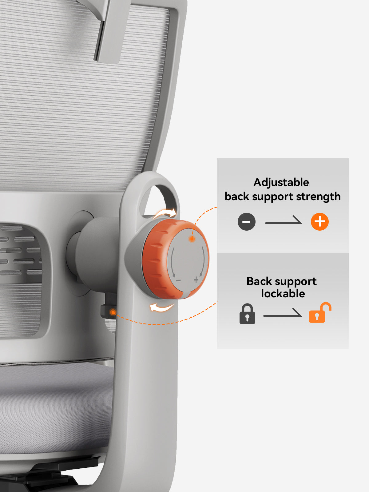 Adjustable back support strength with a locking function ensures proper support for users of varying weights.