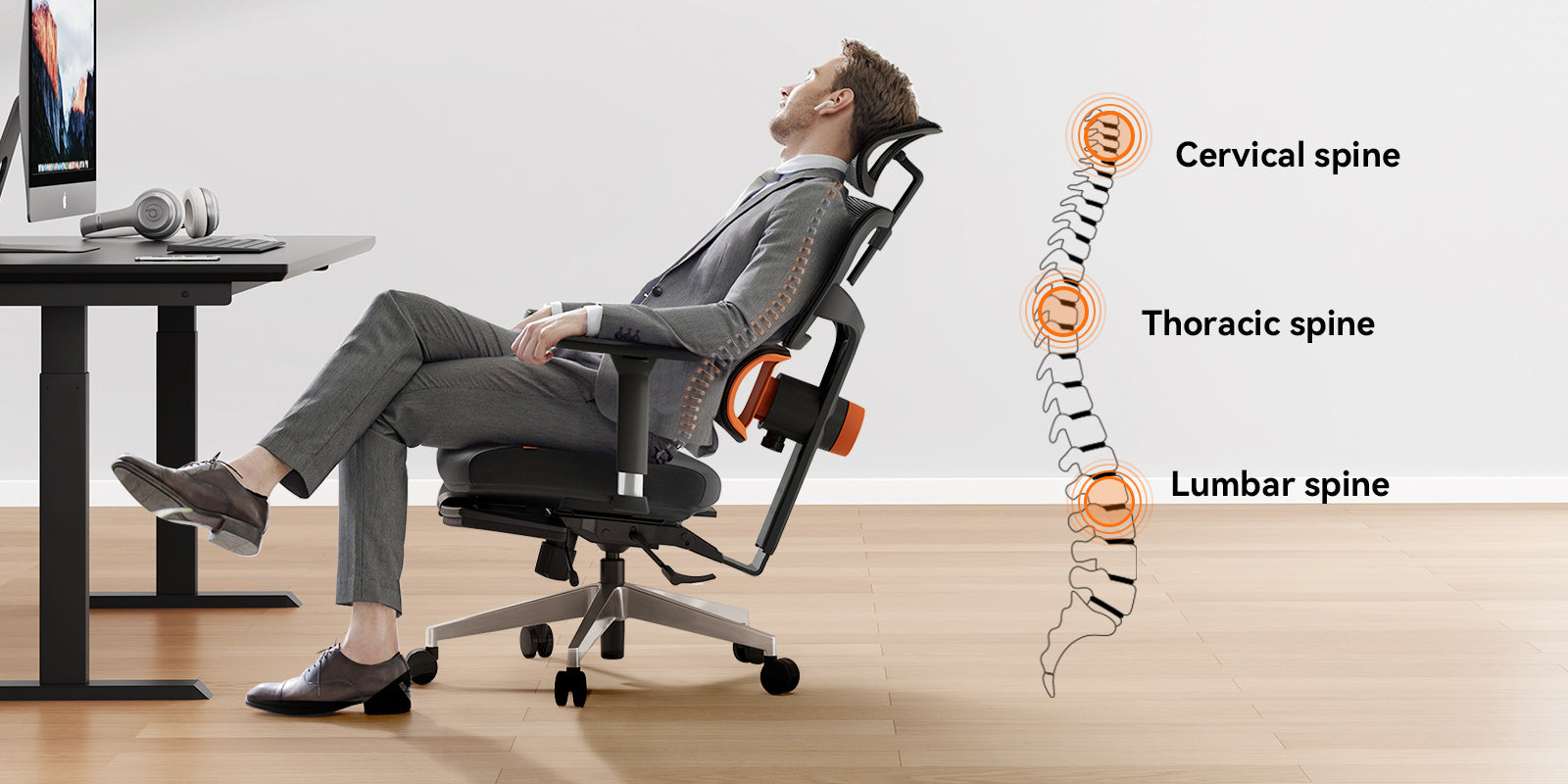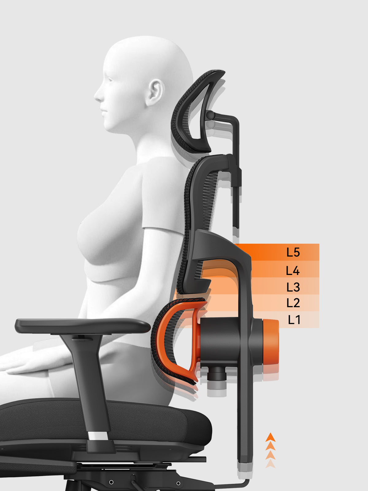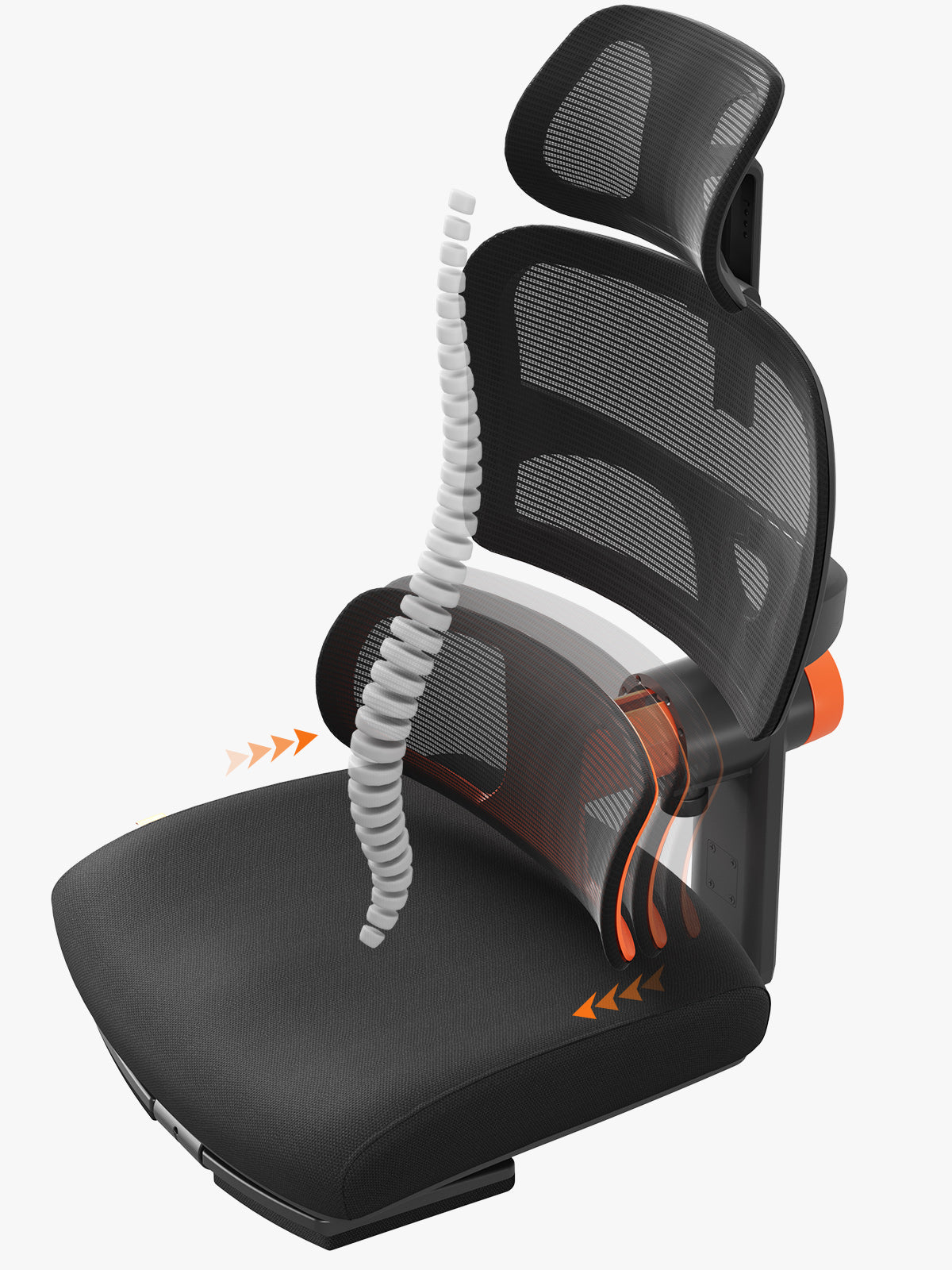 The auto-following lumbar support design provides reliable lower back support. The backrest and lumbar support contour to your spine's natural curves, ensuring your entire spine receives dependable support. This helps prevent and alleviate a range of health issues caused by prolonged sitting at work.