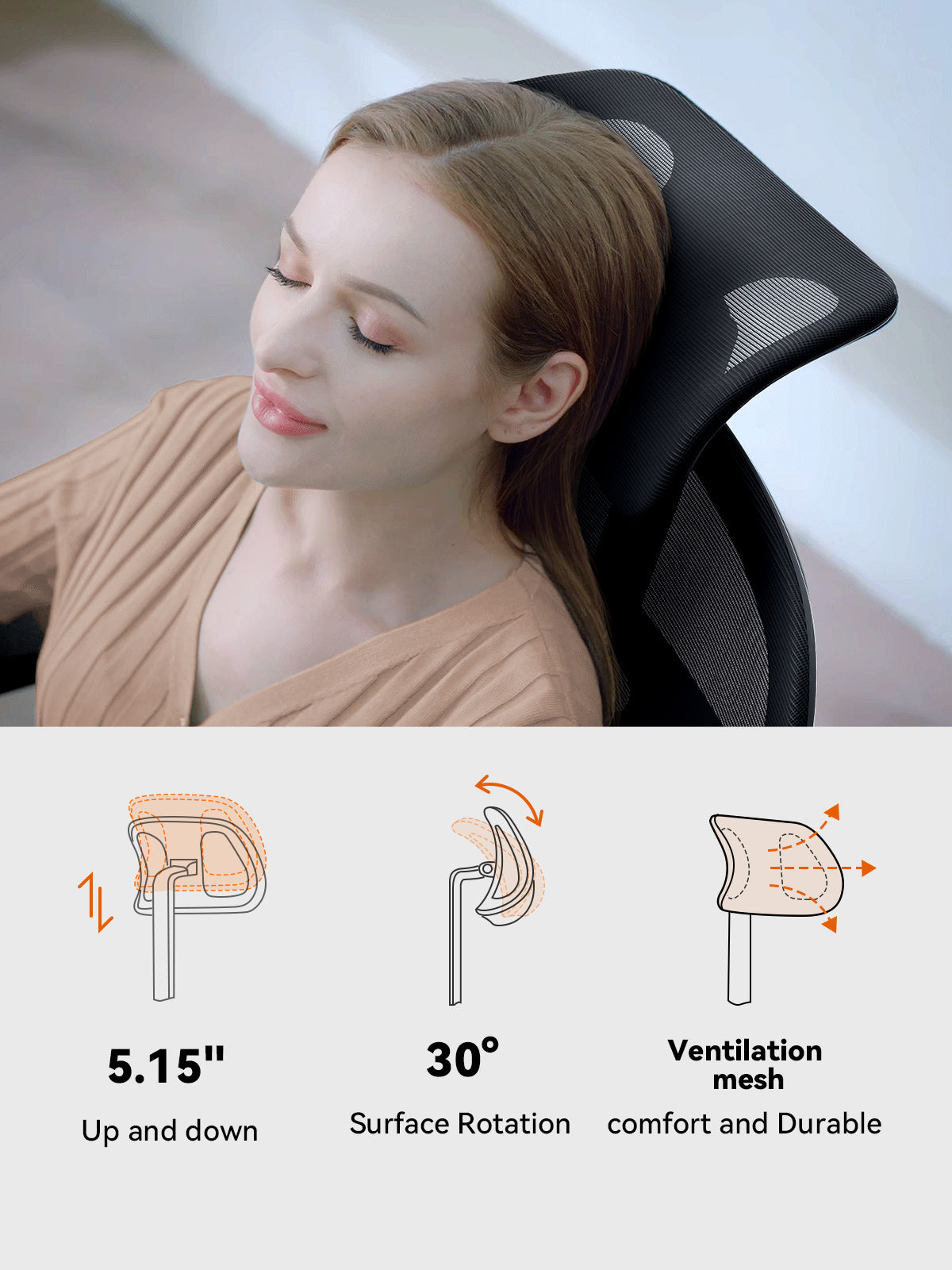 An ergo chair with headrestis designed to cradle your neck and skull dynamically. Our 5D auto-adjusting headrest reduces tension headaches by aligning with your posture shifts, whether you’re typing or leaning back.